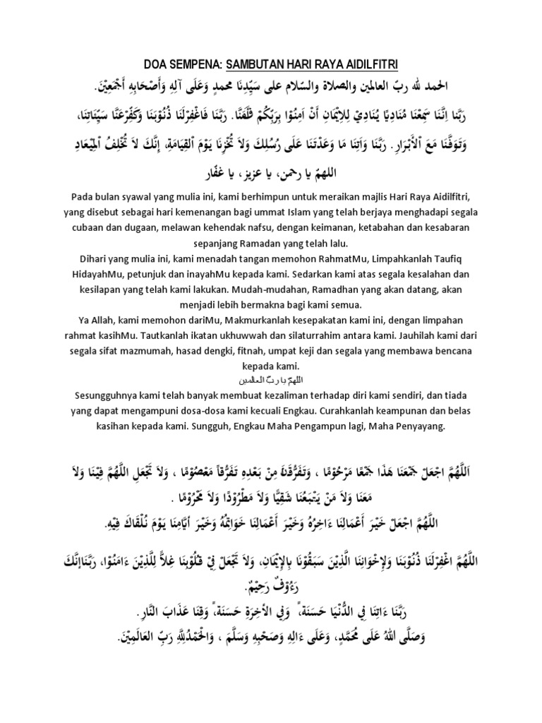 Pada bulan syawal yang mulia ini, kami berhimpun untuk meraikan majlis hari raya aidilfitri, yang disebut sebagai hari kemenangan bagi ummat islam yang telah berjaya menghadapi segala cubaan dan dugaan melawan kehendak nafsu. Mulai dari doa makan, doa tidur, doa di dalam masjid, doa belajar. (b) menetapkan uluhiyah hanya kepada allah semata, tidak ada sekutu bagi allah. Doa majlis kesyukuran dan doa selamat sering dibacakan dalam majlis majlis. Ayah dan ibu adalah sosok yang sangat berjasa dalam hidup kita.