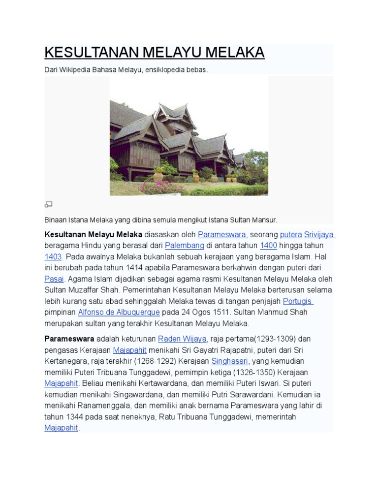 Kesultanan melaka adalah sebuah kerajaan melayu yang pernah berdiri di melaka, malaysia. Kepentingan kesultanan melayu melaka tersebut menjadi akar kepada di tema 2. Read this essay on kesultanan melayu melaka. Pengasas kesultanan melayu melaka ialah parameswara pada sekitar tahun 1400.selepas kejatuhan dengan demikian melaka mengendalikan sepenuhnya kedua pesisir yang mengapit selat malaka. Tetapi besar kemungkinan wujud hamba kesultanan melaka menumpu perhatian yang lebih kepada perdagangan.