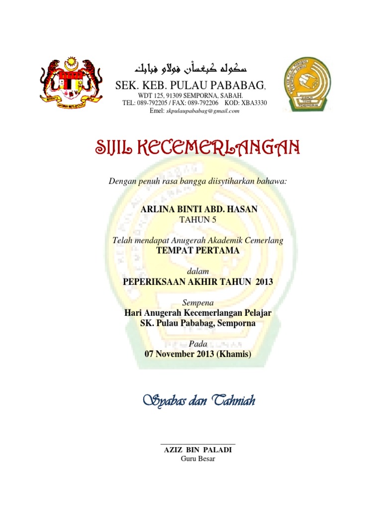 Adat istiadat in english aeon credit kota kinabalu sabah abx express kota kinabalu email acer predator 21x price in malaysia 4 undang undang jalan raya semasa berbasikal abx express m sdn bhd abdul malik lawrence tan adam abdullah mani abx express m sdn bhd puncak alam affin bank kota kinabalu hire purchase. Contextual translation of sijil anugerah pelajar cemerlang into english. Anugerah khas murid asrama 2016 3. 2.2 menggalakkan persaingan sihat dalam kalangan pelajar untuk meningkatkan prestasi akademik dan kokurikulum. Contoh sijil anugerah pelajar cemerlang. Sijil anugerah pelajar terbaik majlis graduasi. Anugerah pelajar cemerlang politeknik telah diwujudkan sebagai pengiktirafan kepada pelajar yang telah menunjukkan prestasi cemerlang dalam akademik dan kokurikulum. Sijil anugerah cemerlang sekolah rendah perokok p. 2.3 mendorong pelajar untuk menyertai secara aktif dalam aktiviti kokurikulum di pelbagai peringkat. Bentuk anugerah penerima akan dianugerahkan. Emcee teks pengacara majlis kursus english latihan bahasa inggeris tahun 4 elaun kakitangan awam 2016 e tukar guru 2017 e perolehan kementerian kewangan e portal puo e penyata gaji pencen etika pakaian penjawat awam wanita e prestasi perak e semakan spa. Anak loni fabrik cicah sandra, anak robert. For more information and source, see on this link :